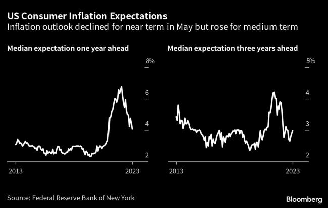 (Bloomberg) -- US consumers’ near-term inflation expectations fell last month to the lowest level in two years as their outlook for personal finances and credit conditions worsened, according to a Federal Reserve Bank of New York survey.